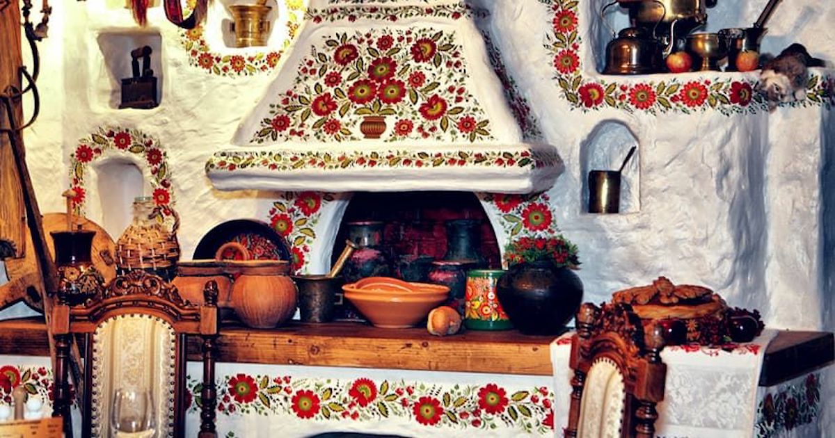 Стіни в хаті також подекуди прикрашалися рослинними орнаментами. Інколи наші предки додавали сюди і зображення птахів – півня, галки, сороки. Ці малюнки виконувалися олійними фарбами.