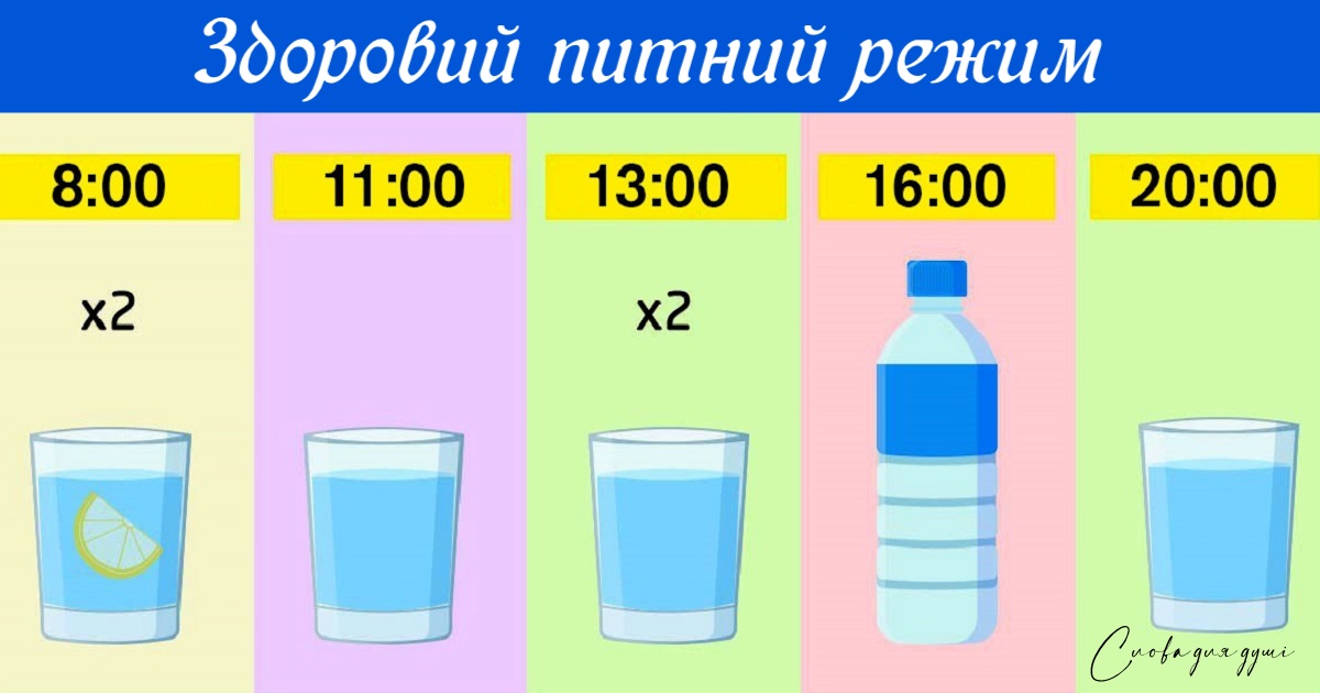 - 20:00. Склянка теплої води. Це завершальний етап. Можна додати у воду шматочок лимона і трохи рідкого меду, що не просто поліпшить смак, але й принесе користь організму.