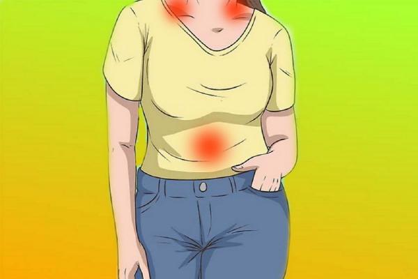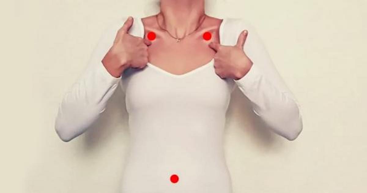 Тепер прикладіть праву долоню на живіт – в область пупка. Великий та середній пальці лівої руки прикладіть між ямочками під ключицями.