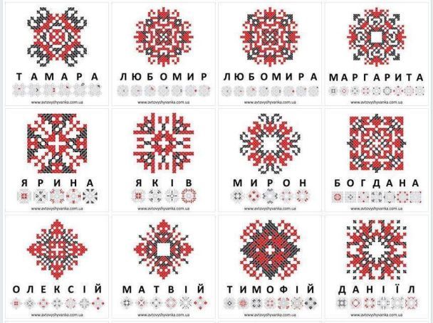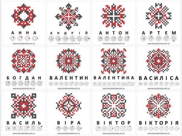 Дослідник українських писанки й вишивки Володимир Підгірняк шляхом аналізу народної творчості прикарпатського краю виявив певні закономірності в орнаментах, що наштовхнули його на виявлення та оприлюднення закодованої інформації. Ось такий вигляд, на його думку, мають у вишивках закодовані імена українців.
