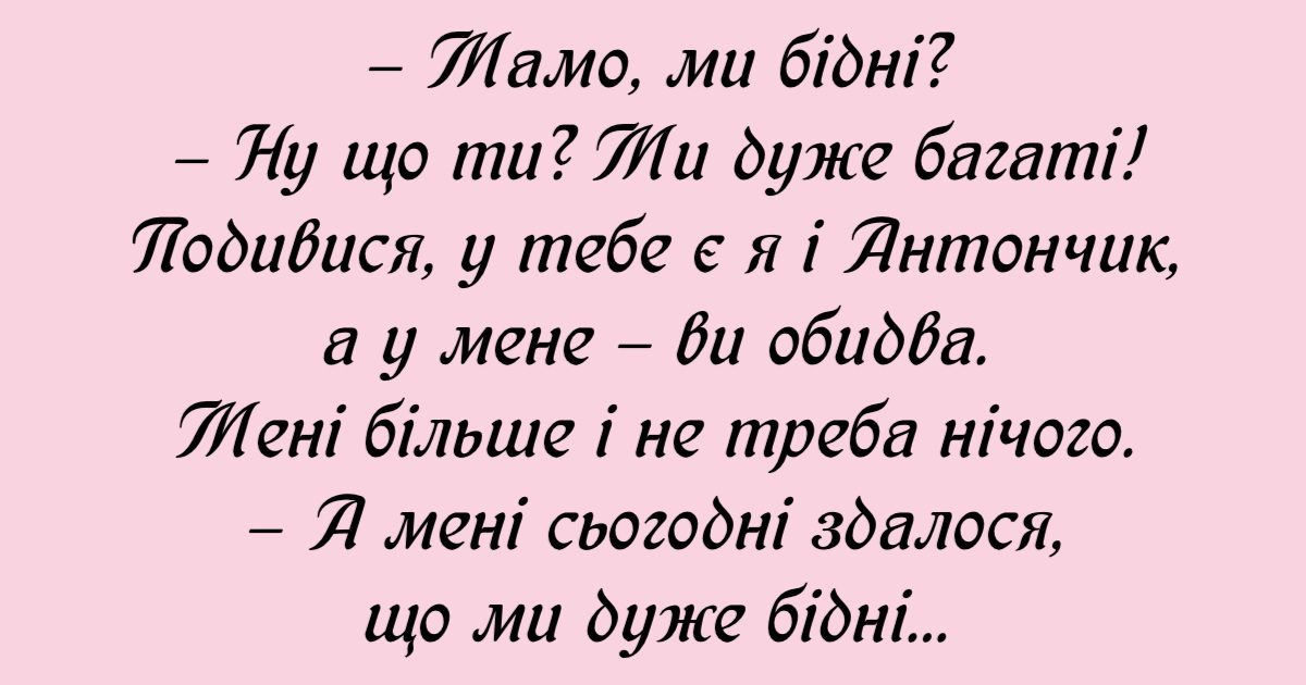 – Ну що ти? Ми дуже багаті! Подивися, у тебе є я і Антончик, а у мене – ви обидва. Мені більше і не треба нічого.