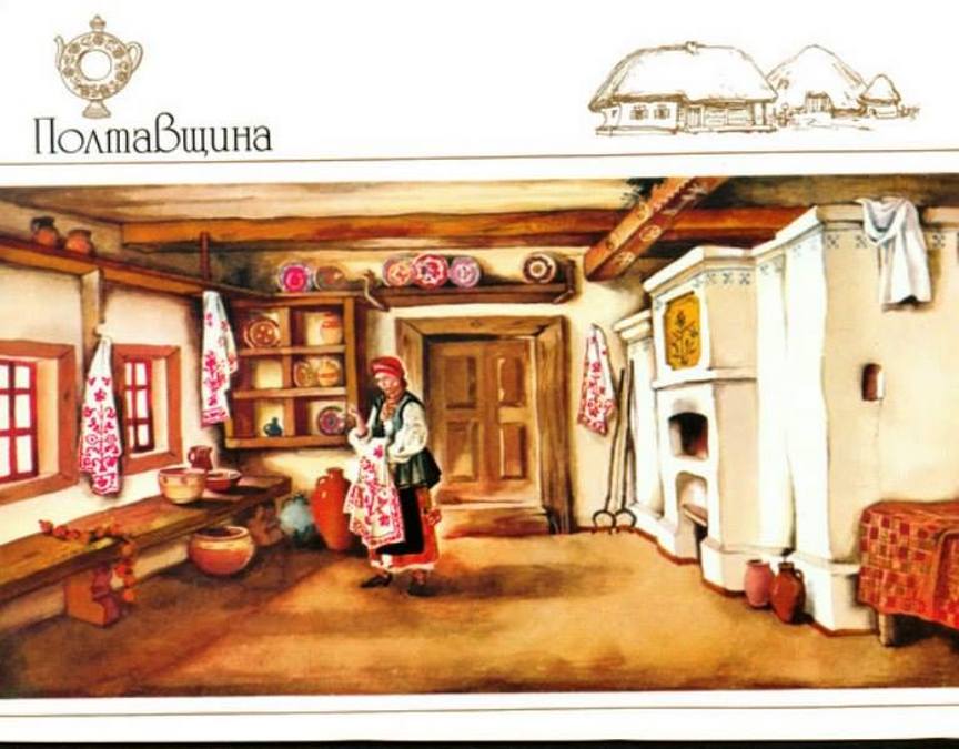 Типовим інтер’єром для лівобережних районів житла був полтавський (Полтавська область). Для нього характерно те, що піч розміщувалась в кутку біля дверей. Припічок печі був закритий стінами комина. Мисник знаходився в протилежному боці. В найсвітлішій частині хати ставили довгу лаву на якій встановлювали кужіль з прядивом.
