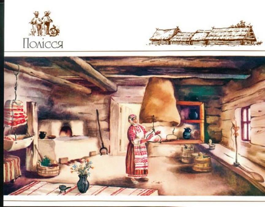 Такими ж архаїчними і простими були й речі поліщуків. Керамічний посуд – горщики, глечики, гладушки (глечики без ручки) – був димлений. Серед меблів – ослін, стіл (сектор харчування), піл, ліжко і колиска (спальний центр). Також в хаті були мисник і скриня, щоб було де складати речі. Мисник – для посуду, а в скриню складали одяг. Такий інтер’єр в цілому був характерний для всіх українських регіонів.