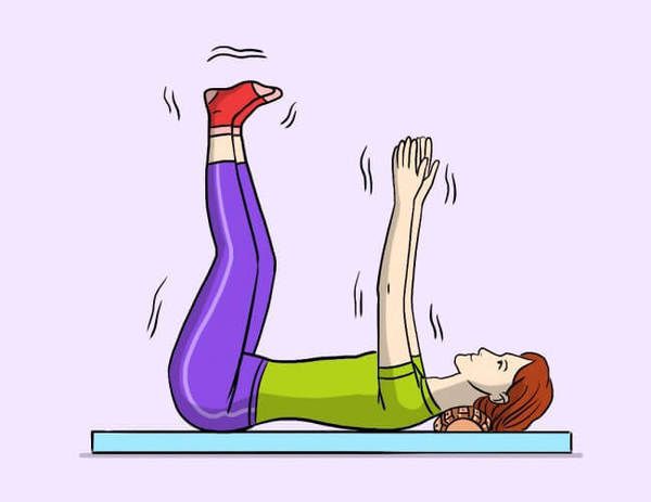 Стопи розташуйте так, щоб вони були перпендикулярні підлозі. Витягніть ліву п’ятку вперед і одночасно потягніть ліву руку вгору, не відриваючи її від підлоги. Повторіть те ж саме для правої п’яти і правої руки. Всі вправи займають 2 хвилини.