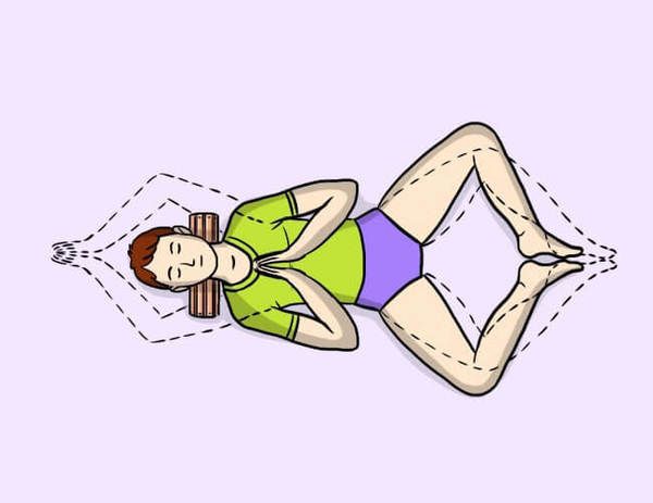 Ляжте на тверду поверхню і підкладіть під 3-й і 4-й шийні хребці твердий валик. Ноги зігніть в колінах, не відриваючи від підлоги, і зімкніть стопи. Вправи необхідно повторити 10 разів.