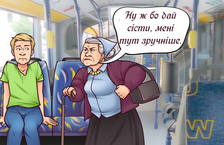 Про хамство бабусь у громадському транспорті вже ходять легенди. Навіть якщо в маршрутці повно вільних місць, їм конче потрібно когось зігнати.
