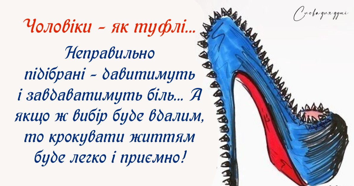 На світі є партнери, як туфлі на вихід. Дико незручні, але пафосні та статусні. Тобто вони потрібні, щоб їх сфотографувати, щоб вам почали всі заздрити, щоб зітхали, а ви виклали це в Instagram. Але потім, коли приходиш додому, ти скидаєш ці туфлі, взуваєш тапочки і приходить щастя.