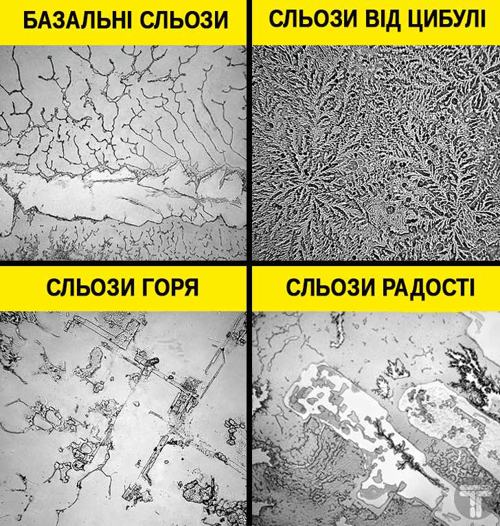 3. Психічні (емоційні) сльози – з’являються, коли ваша команда виграє важливий матч або коли ви розлучаєтеся з близькою людиною. Але попри те, що це одна група сліз, під мікроскопом вони можуть виглядати по-різному.