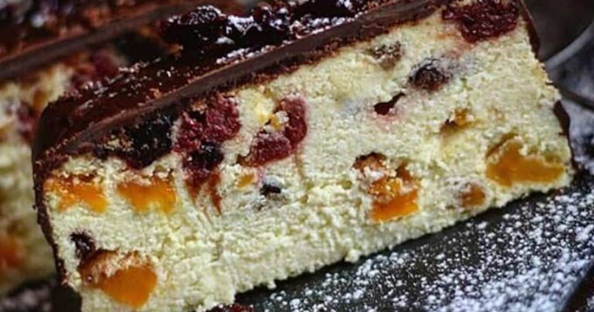 - Після цього до сиру додаємо нарізані сухофрукти, знову все перемішуємо і виливаємо суміш у форму, застелену пергаментом і змащену маслом.