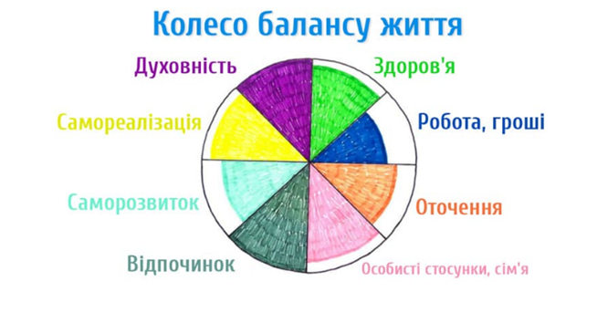 Колесо життя наочно покаже, наскільки ви дотримуєтеся балансу різних аспектів свого життя. Це вправу потрібно робити мінімум один раз на місяць, щоб бачити, на чому Їдете по своєму життєдайному шляху.