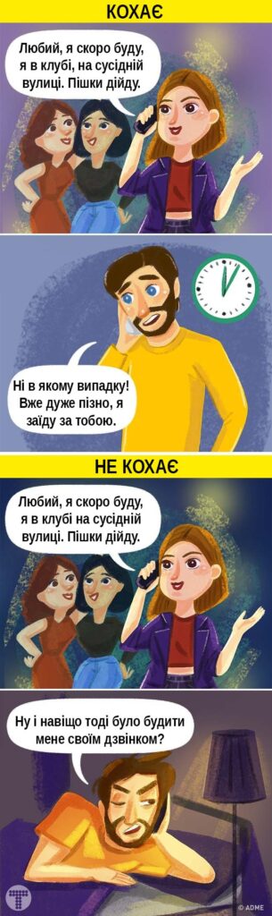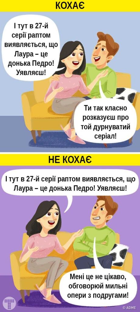 І все ж, якщо чоловік бачить, що вам дуже важливо висловити свої думки, він зробить над собою зусилля та уважно вислухає вас, навіть, якщо йому ця тема зовсім нецікава. Коли він вас любить, він не залишить вас без уваги. А якщо він переводить тему або тікає у справах щоразу, коли ви намагаєтеся поговорити, швидше за все, ваші переживання його не хвилюють. Відповідно, і розв’язувати проблеми, що накопичилися у стосунках, він не збирається.