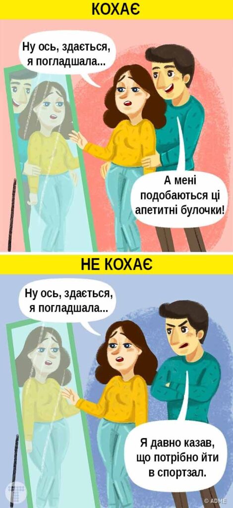 Є таке мудре висловлювання Омара Хайяма: «В коханій людині подобаються навіть недоліки, а в не коханій дратують навіть чесноти». Для істинно люблячого чоловіка ви завжди прекрасні, навіть розхристана та в піжамі, яку отримали від бабусі. Він і не помітить, що ви набрали кілька зайвих кілограмів після зимових свят, якщо ви самі не скажете про це. А ось якщо чоловік постійно жене вас в спортзал або натякає, що вам потрібна пластична операція, не поспішайте виконувати це йому. Швидше за все, якщо його не влаштовує ваша зовнішність — його не влаштовуєте і ви самі. І навіть якщо ви схуднете, він все одно знайде до чого причепитися.