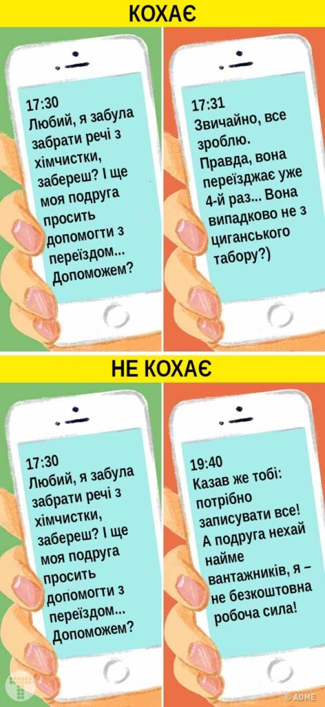Для люблячого чоловіка на першому місці завжди будуть прохання і бажання коханої дівчини (а не приятелів чи далеких родичів). Насправді чоловікам подобається допомагати жінкам — це дає їм можливість продемонструвати, які вони круті, сильні та відповідальні. Звичайно, бувають ситуації, коли чоловік не в змозі допомогти сам, наприклад, він не вміє лагодити кран, але він точно не повинен залишати вас саму розбиратися з цією проблемою, він викличе сантехніка. Якщо ж безневинне прохання, наприклад, «коханий, вкрути, будь ласка, лампочку» сприймається з бурчанням як чергове непосильне завдання, варто замислитися — а чи не допомагає ваш чоловік якійсь іншій жінці, причому з набагато більшим ентузіазмом?