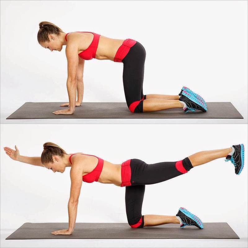 Початкова позиція – як на першій картинці: стійка на руках і колінах. Далі випрямляєте одну ногу, при цьому намагаючись тримати її прямо, не згинаючи і не відхиляючи вбік. Одночасно з ногою піднімаєте і випрямляєте протилежну руку. Далі робите те ж саме з іншою рукою і ногою.