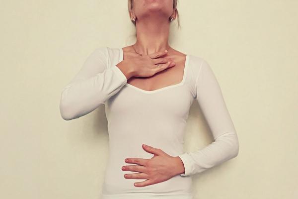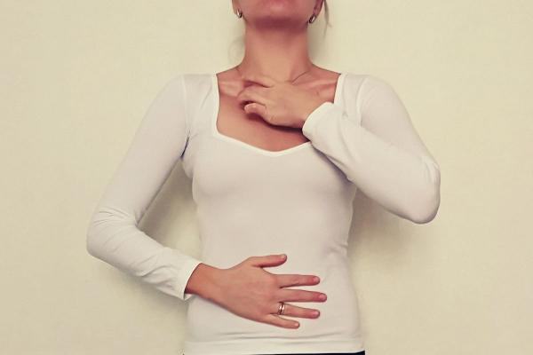 Тепер прикладіть праву долоню на живіт – в область пупка. Великий та середній пальці лівої руки прикладіть між ямочками під ключицями.