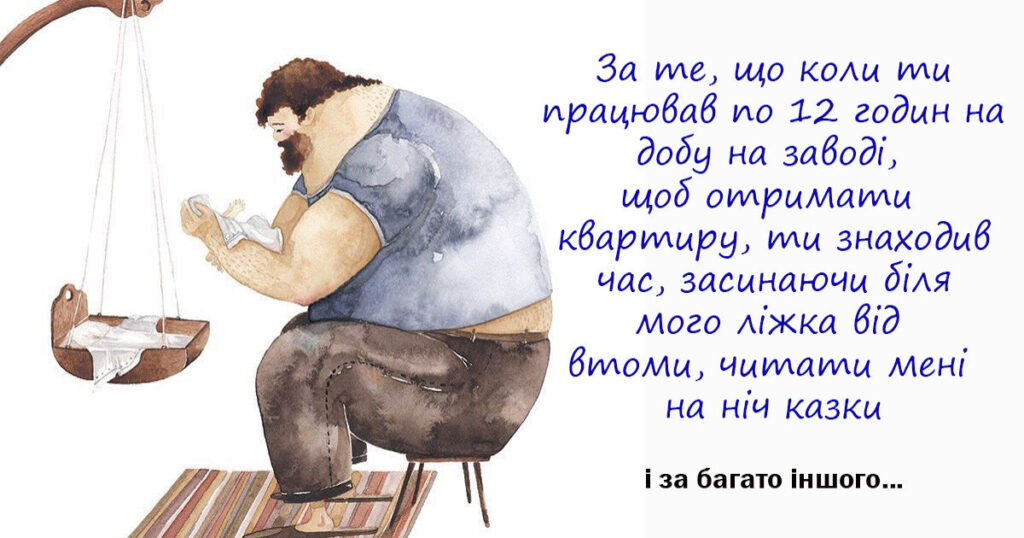 По кімнаті нервово ходить тато в сірому костюмі, смикаючи себе за краватку, і скоса поглядаючи на пляшку гopілки. Тато сьогодні її вuп’є і буде смішно танцювати, згинаючи коліна. Ми з Машкою завжди сміємося коли він так танцює.