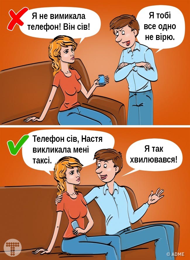 У такій ситуації слід взяти себе в руки, добре все обдумати і спокійно пояснити, що вас турбує. Але фраза «Ти накручуєш себе» — це не відповідь. Попросіть чоловіка озвучити його точку зору. Якщо ж він знову повернеться до цієї фрази, задумайтеся: ймовірно, він вже давно до вас охолов.