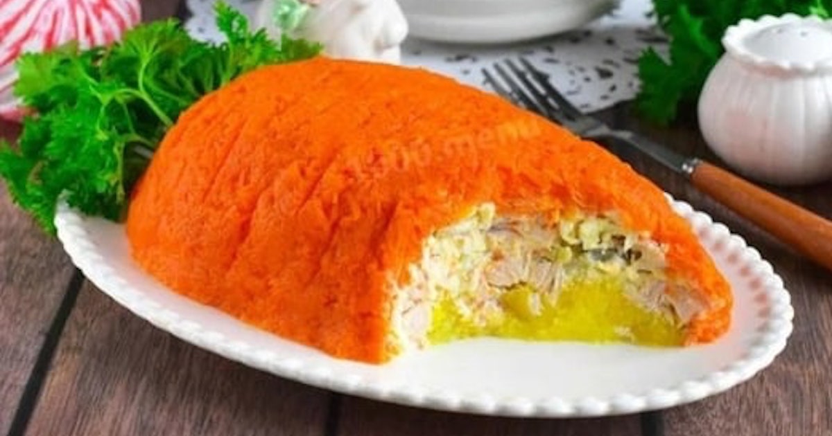 5. Усю поверхню салату покрийте тертою морквою і пригладьте.
