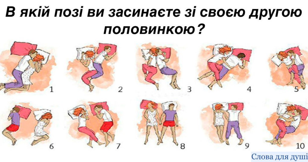 Цю позу віддають перевагу людям, які люблять один одного, але їхні стосунки все ж таки вимагають пильної уваги. Психологи зазначають, що той, хто спить на спині, не має потреби бачити свого партнера, а сплячий на животі – упертий і дещо замкнутий. Водночас переплетення ніг свідчить, що люди мають зобов’язання один перед одним.
