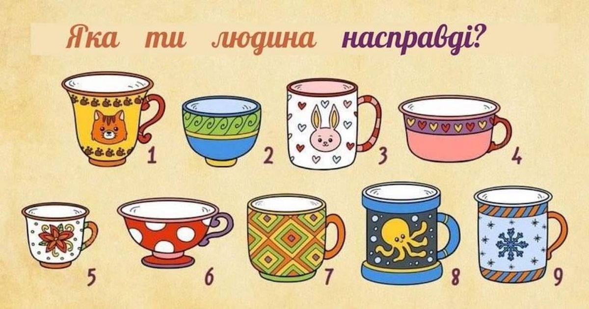 Тут ти знайдеш досить простий і гарний тест, де потрібно всього лише вибрати вподобану чашку. А вона вже розповість про основні риси твого характеру.