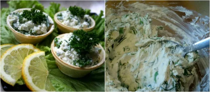 100 г домашнього сиру + зубчик часнику + пучок подрібненої зелені кропу. Часник пропусти через прес, змішай з сиром і зеленню. Готові тарталетки прикрась зеленню або смужками болгарського перцю.