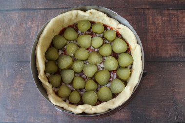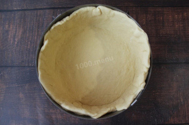 За цей час тісто мало підрости. Обомніть тісто і розділіть його на 2 частини в наступній пропорції: 1/4 і 3/4. Візьміть більшу частину та розкачуйте з неї велике коло. Акуратно перенесіть тісто в змащену олією форму, формуючи дно і бортики майбутнього пирога. Для цього пироги потрібна невелика форма діаметром 20 см.
