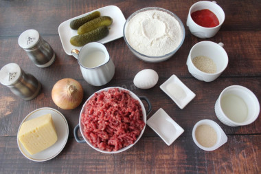 Підготуйте інгредієнти. Для тесту використовуйте борошно вищого ґатунку, яйце категорії С1, сухі дріжджі швидкодіючі. Для начинки візьміть яловичий фарш, як у справжньому чизбургері, але за бажання його можна замінити на свинячий. Сир використовується твердий. Не використовуйте пармезан, грана падано та сири, які мають дуже яскравий незвичайний смак, вони будуть не доречні. Для посипання використовується насіння білого кунжуту.