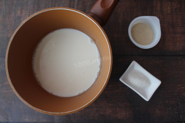 Підігрійте молоко до теплого стану (приблизно 30 С) та перелийте в миску для замішування тіста. Для активації дріжджів молоко має бути обов’язково теплим, але не гарячим, інакше дріжджі загинуть. Далі в миску всипте швидкодіючі сухі дріжджі і цукор, і, перемішуючи, розчиніть сипучі інгредієнти в теплому молоці. Майте на увазі, в молоці не повинно залишитися ні крупинок, ні грудочок. Відставте миску на 10-15 хвилин для закваски.