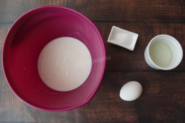 Після закінчення часу вбийте в миску куряче яйце, додайте сіль і влийте олію без запаху, яка додасть тесту еластичність. Збийте вміст миски віночком.