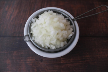 Цибулю очистіть від лушпиння, сполосніть під водою і наріжте дрібними кубиками. Обдайте кубики цибулі окропом, щоб прибрати гіркоту. Відкиньте на друшляк і дайте стекти всій рідині. Приготувавши цибулю саме таким чином, у готовому пирозі, як і в чизбургері, вона похрустуватиме. Якщо ж ви віддаєте перевагу більш м’якій цибулі, її можна обсмажити на сковороді до м’якості.