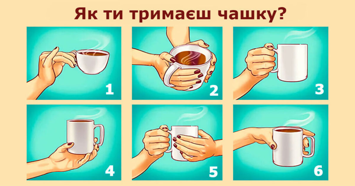Виявляється, навіть маленькі дрібниці із повсякденного життя можуть багато розповісти про нашу особистість. Ви коли-небудь задумувалися над тим, що те, як ви тримаєте чашку у руці може чудово схарактеризувати вашу особистість? Якщо ні, то варто! Сьогодні, ми розповімо вам трохи більше. Просто оберіть картинку, на якій зображено те, як ви зазвичай тримаєте свою чашку.