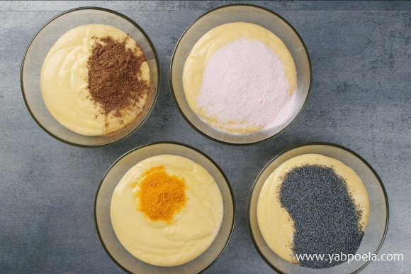 Тісто перекладіть у рівній кількості у чотири різні ємності. І в кожну з ємностей додайте по наповнювачу: какао, мак, куркуму та кисіль. Кожне тісто добре перемішайте.