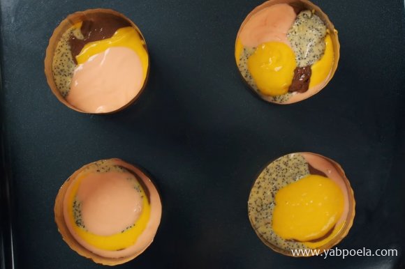 У форми для запікання пасок викладайте по черзі по ложці кожного тіста, поки форми не заповняться на 2/3.
