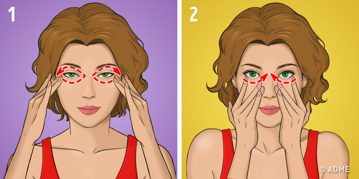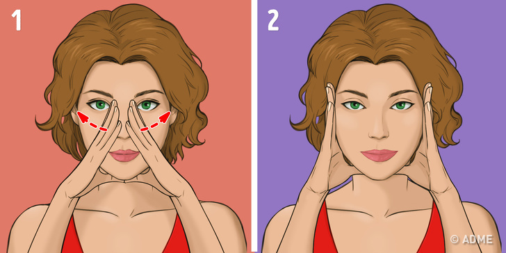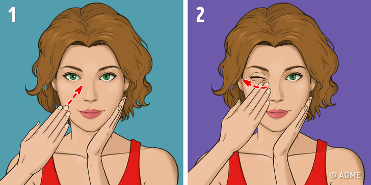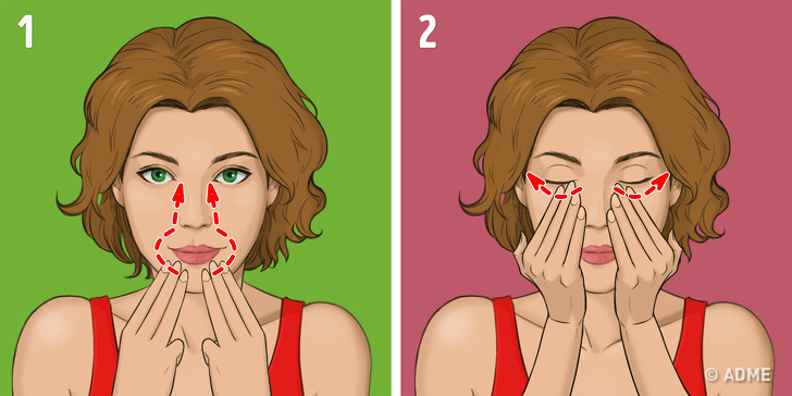 - Залишаючи великі пальці на місці, проведіть іншими від носа до скронь, трохи натягуючи шкіру (мал. 2).