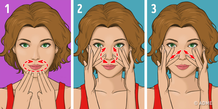 - Натисніть подушечками трьох пальців на центр підборіддя і проведіть півкола до верхньої губи (мал. 1).