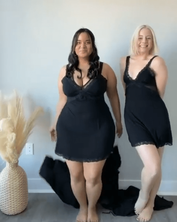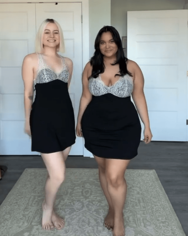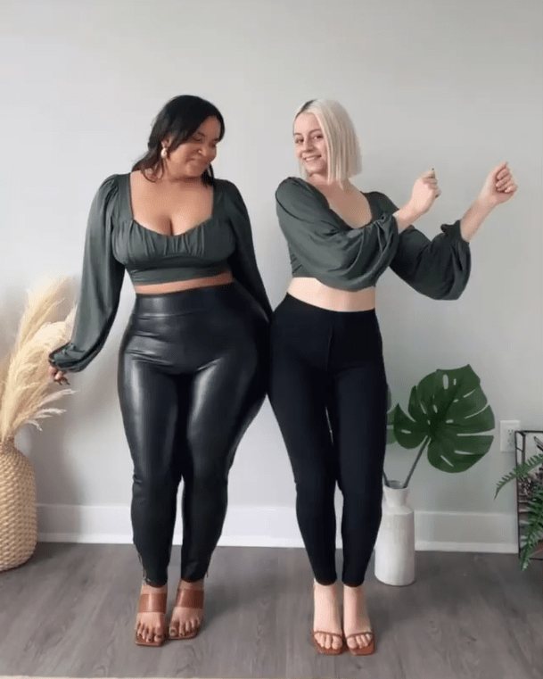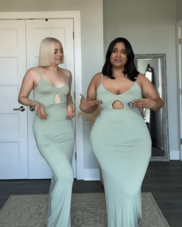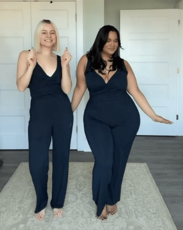Дві подруги приміряють однаковий одяг, щоб показати, як він виглядає на різних фігурах.