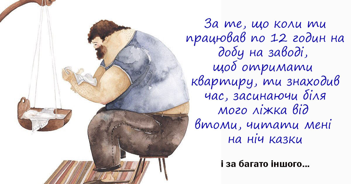 -За те, що коли ти працював по 12 годин на добу на заводі, щоб отримати квартиру, ти знаходив час, засинаючи біля мого ліжка від втоми, читати мені на ніч казки;