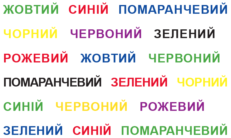 порядку з першого слова називати вголос колір, яким написаний текст.