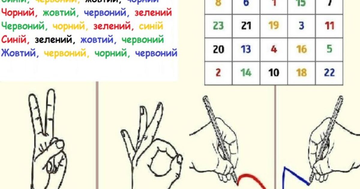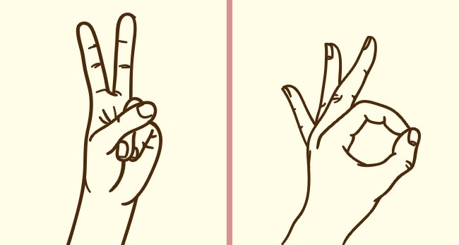 Складіть пальці правої руки так, щоб вони показували знак «мир», пальцями лівої руки покажіть «ок». Потім по черзі змініть положення пальців так, щоб вже ліва рука показувала «мир», права – «ок». Повторіть кілька разів. А тепер виконайте цю вправу одночасно правою і лівою рукою.