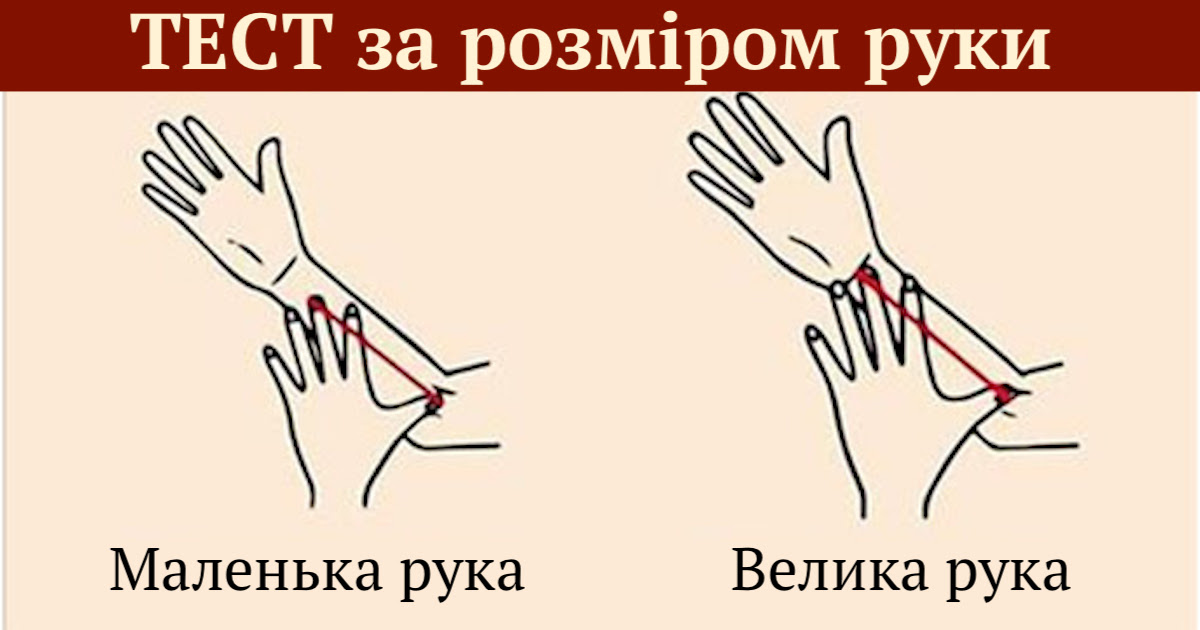 Руки можуть багато чого сказати про людину. І ми зараз зовсім не про хіромантію або ворожіння по довжині пальців, ні! Дещо цікаве тобі може розповісти і інший показник. Тут все просто: спробуй виміряти пальцями однієї руки відстань від зап’ястя до ліктя (або навпаки) іншої руки. Якщо пальців «вистачить», щоб охопити його повністю, то у тебе явно велика рука, якщо ні – маленька.