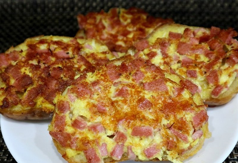 Ковбасу потрібно нарізати кубиками, а сир натерти на грубій тертці. Інгредієнти змішати між собою та додати яйце і сметану… Сіль та перець додати за смаком. Викласти отриману масу на скибки батона, а потім смажити бутерброди на рослинній олії спершу начинкою вниз, а потім з іншої сторони.