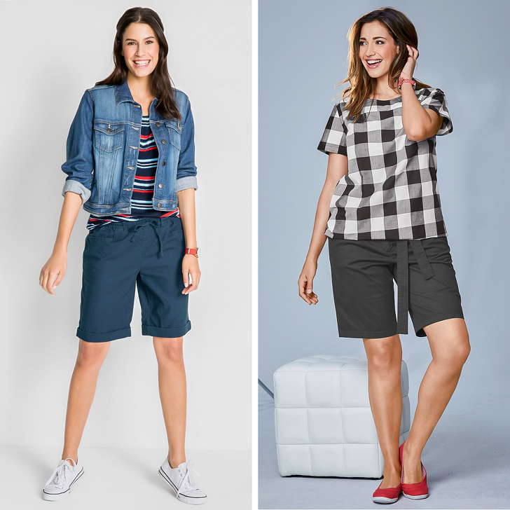 Шорти такого фасону були придумані для англійських військових, які розміщувалися на території Бермудських островів. Спочатку вони мали накладні кишені, проте згодом з’явилася модель і без них, що стала актуальним предметом жіночого гардеробу. Щоб модель була універсальною, варто вибрати бермуди нейтрального відтінку довжиною на 10 см вище коліна, з посадкою на талії або трохи нижче, які нагадують класичні брюки.