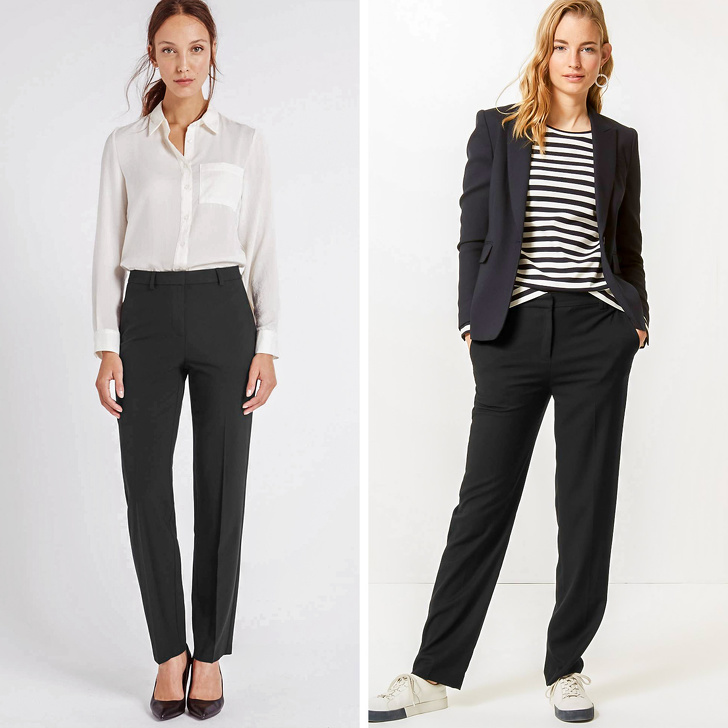 Ще один предмет чоловічого гардероба, адаптований під жіночу фігуру все тієї ж Коко Шанель і увійшов у жіночу моду в чому завдяки Марлен Дітріх, — невід’ємна частина так званого базового гардероба. Щоб модель класичних брюк підходила під будь-який образ, варто віддати перевагу сидить по фігурі моделей з прямим або трохи розкльошені від стегна кроєм і посадкою на талії, зшитим з якісної тканини, та бажано чорного або темно-синього кольору.