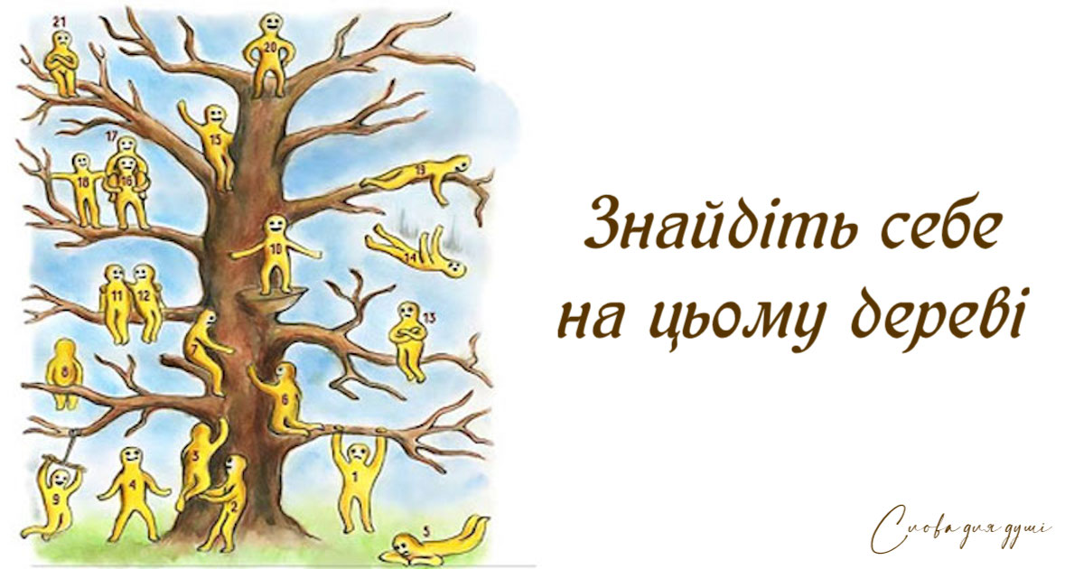 У кожного з цих чоловічків на дереві різний настрій і вони займають різне місця. Для початку визначте, який з них найбільше схожий на вас. Після цього виберіть чоловічка, на якого ви б хотіли бути схожі.