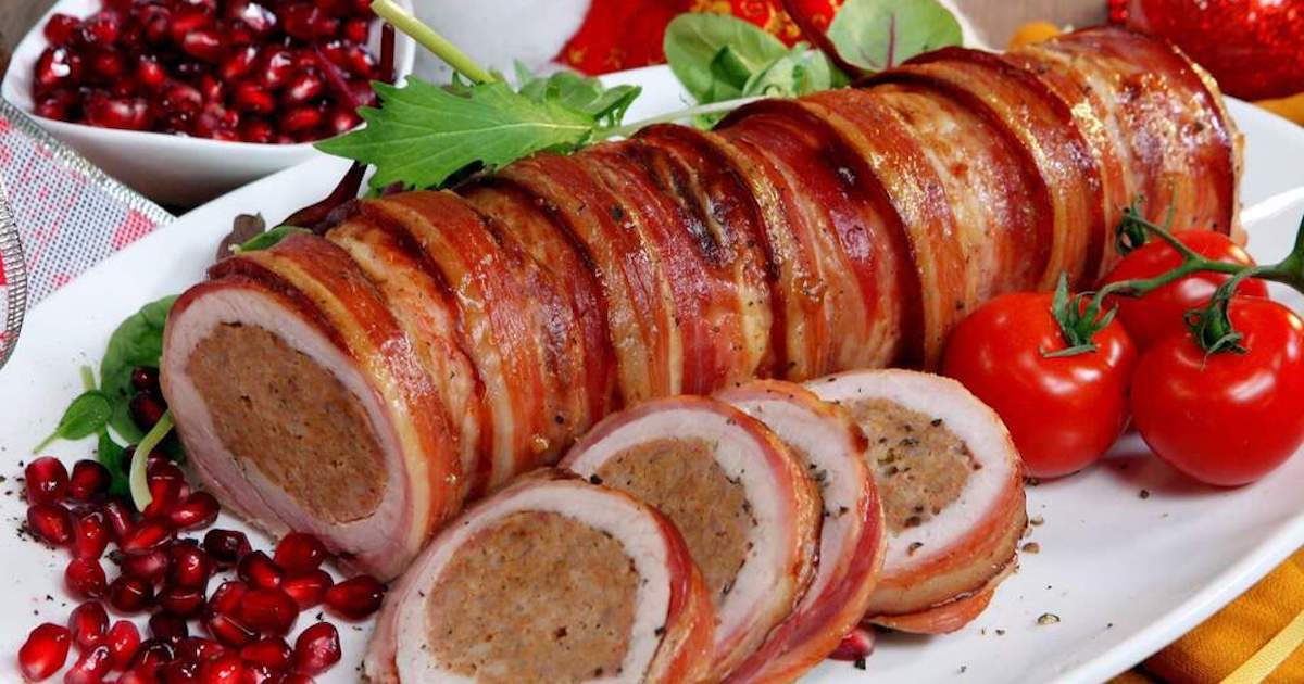 Ароматний рулет з індички з пряним свинячим фаршем, загорнутий у свинячу грудинку – безпрограшний варінт до новорічного столу.