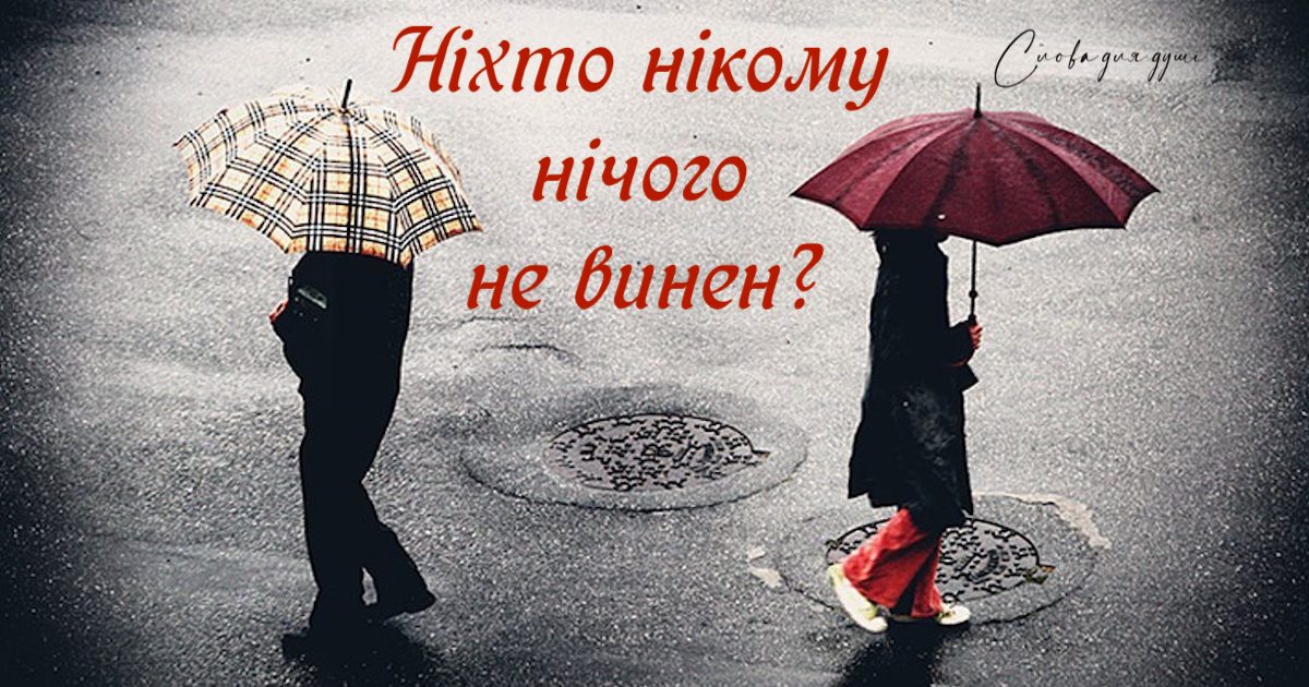 Зараз дуже популярний вислів: “Ніхто нікому нічого не винен”. Як на мене, то це безглузде твердження. Адже людина – соціальна істота, яка спілкується з іншими собі подібними. Вона дає комусь надію, обіцяє і переконує. Зрештою, совість ще ніхто не скасовував. Ти прийшов у чиєсь життя або впустив когось у своє. Це тягне за собою певні обов’язки.